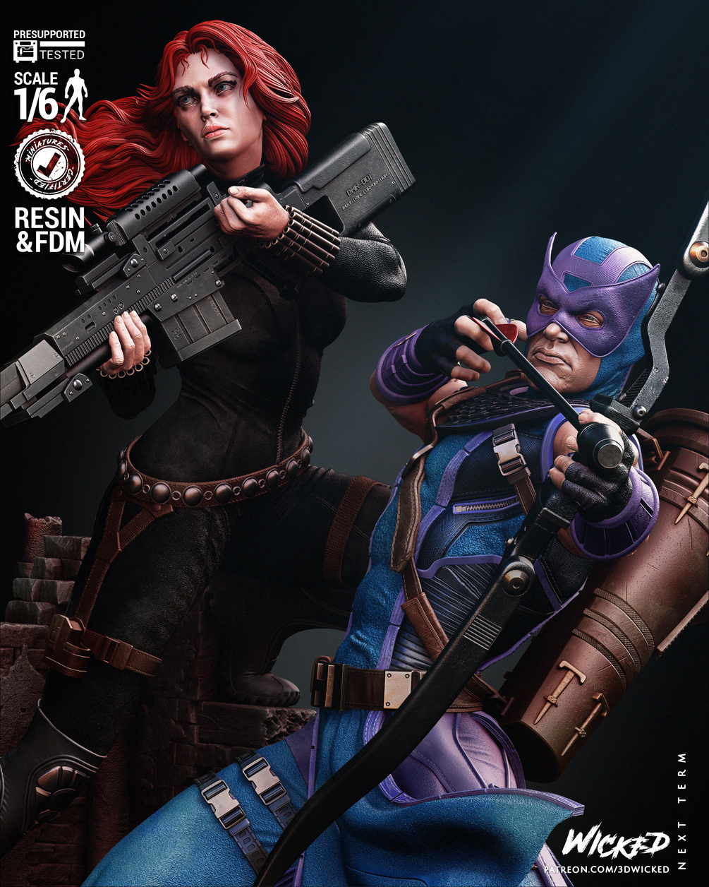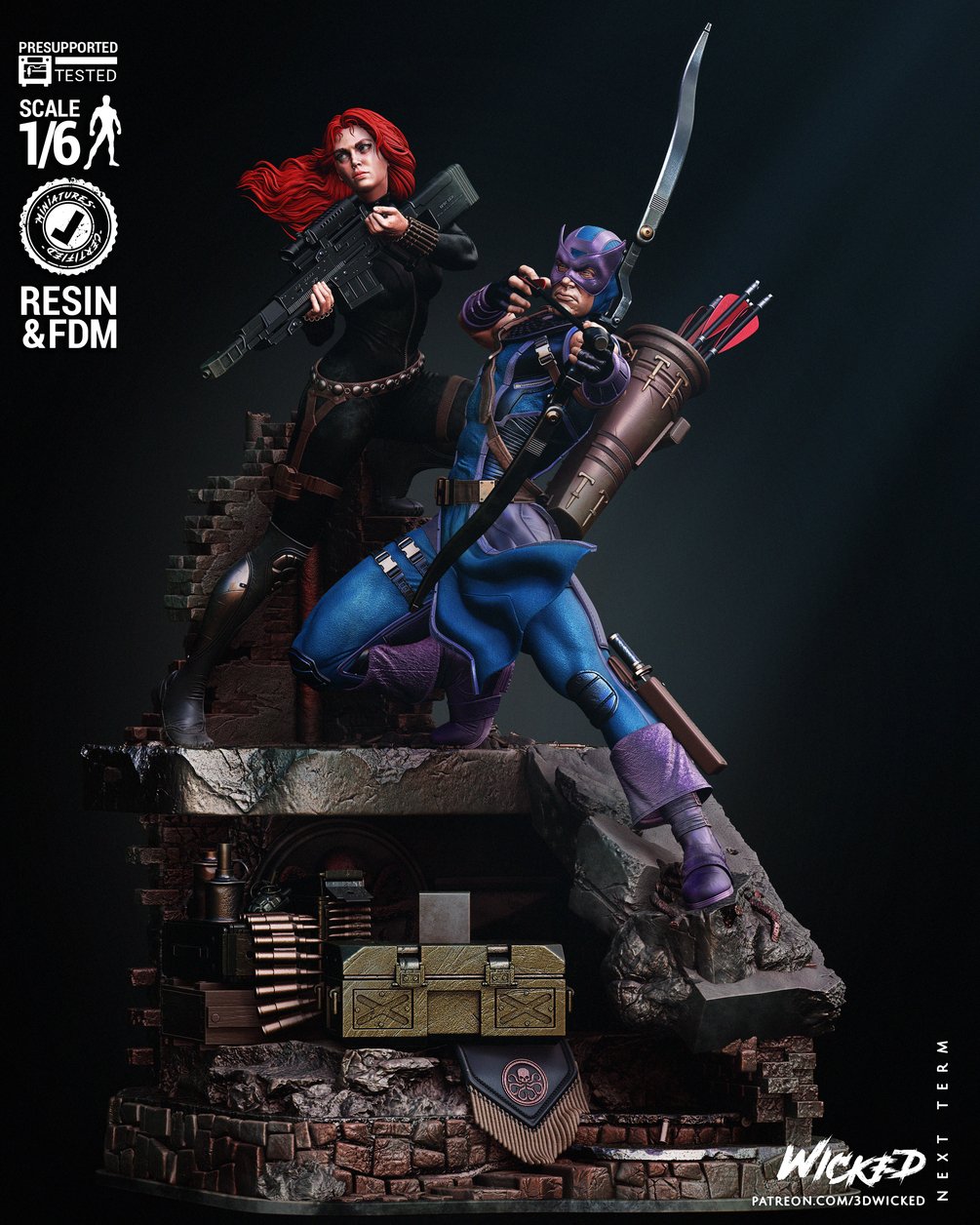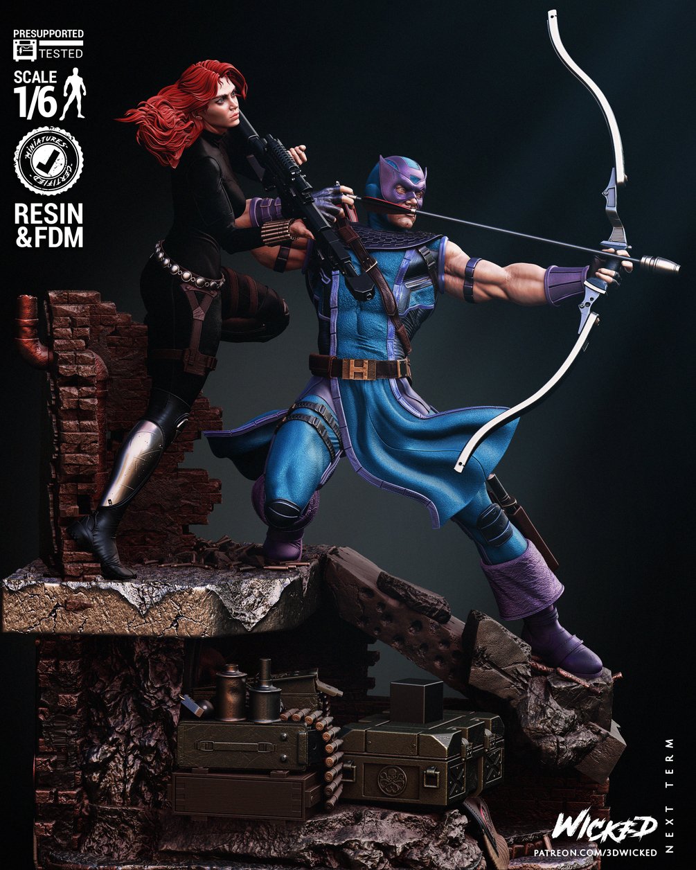Hawkeye and Black Widow Diorama Sculpture. Non Supported, Pre Supported and One Piece Files