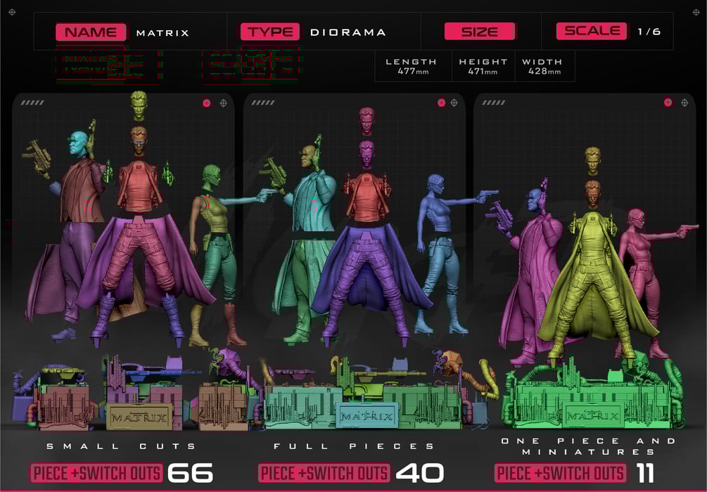 Matrix Diorama (Neo, Trinity, and Morpheus). Non Supported, Pre Supported and One Piece Files