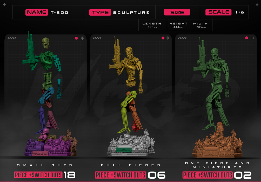 T 800 Sculpture. Non Supported, Pre Supported and One Piece Files